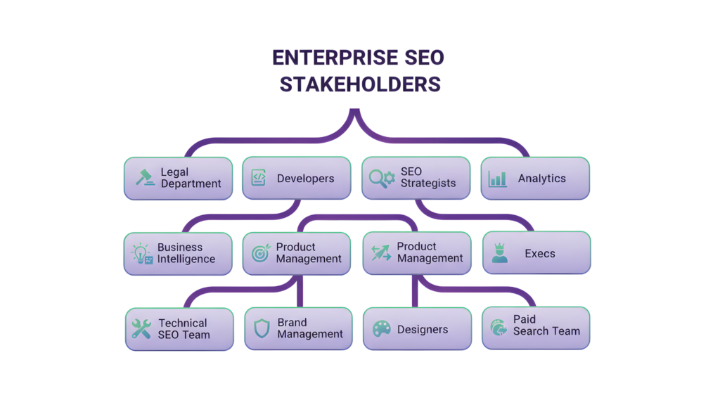 There’s another reason – organizational complexity. Enterprise SEO needs teams to work together between departments, and often between countries and time zones. You won’t report directly to founders or CEOs. Instead, you’ll work through several management layers, which slows down decisions and implementation.